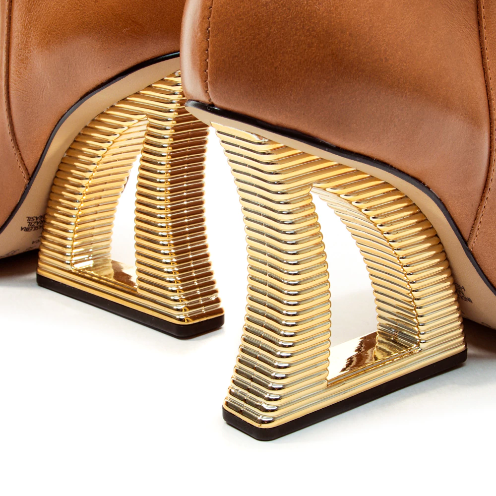 uma bota de cano curto em couro, com um salto alto escultural, apresenta um design moderno e elegante. o couro confere durabilidade e sofisticação, enquanto o cano curto adiciona uma vibe contemporânea. o destaque está no salto alto, que possui um design escultural vazado, adicionando um toque de ousadia e estilo único ao calçado. esta combinação de elementos resulta em uma bota que é ao mesmo tempo refinada e marcante, perfeita para quem busca uma peça de destaque para complementar looks diversos.