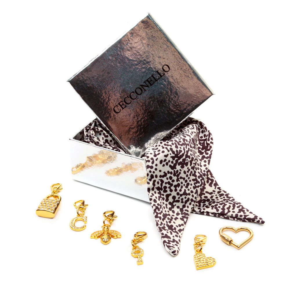transforme seus acessórios e looks com o charme do kit charms da cecconello. este conjunto exclusivo combina um elegante lenço com estampas vibrantes e atemporais, acompanhado de delicados pingentes dourados que irradiam sofisticação. versátil e repleto de estilo, o kit convida à criatividade, permitindo inúmeras formas de uso: amarre o lenço em bolsas, chapéus, ou use-o como faixa para cabelo, enquanto os pingentes podem ser adicionados para personalizar ainda mais o visual. uma peça que celebra a imaginação e a originalidade, trazendo um toque de glamour a qualquer ocasião.