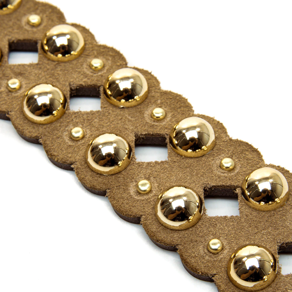 cinto feminino confeccionado em couro, com recortes a laser que revelam um trabalho delicado e elegante. detalhes em semi esferas e cravos dourados elevam o visual com um toque de brilho sutil. as tiras de couro nas extremidades permitem amarração ajustável, criando um acabamento moderno e versátil — ideal para compor looks com personalidade e estilo.