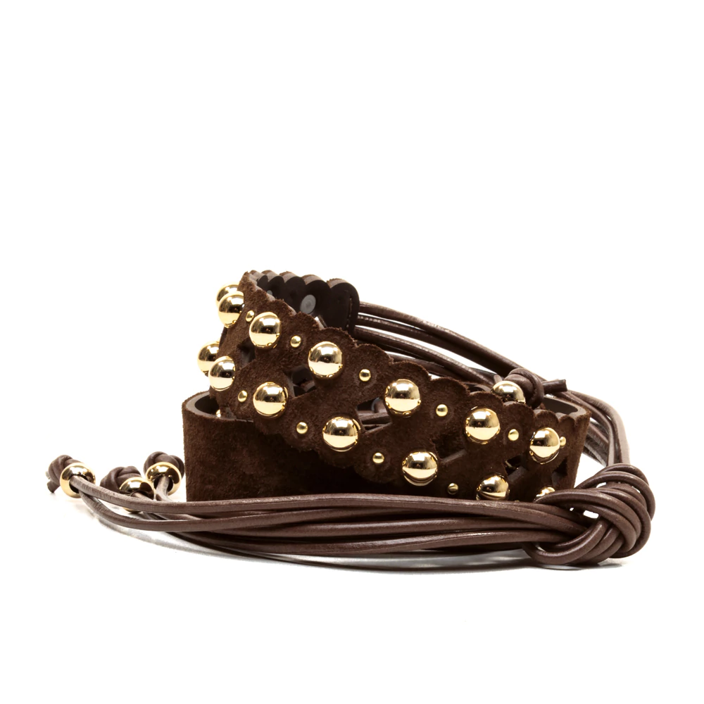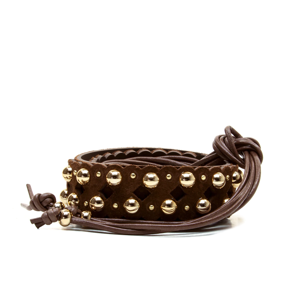 cinto feminino confeccionado em couro, com recortes a laser que revelam um trabalho delicado e elegante. detalhes em semi esferas e cravos dourados elevam o visual com um toque de brilho sutil. as tiras de couro nas extremidades permitem amarração ajustável, criando um acabamento moderno e versátil — ideal para compor looks com personalidade e estilo.