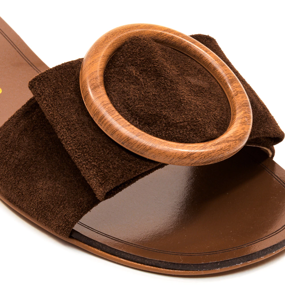com design minimalista e toque natural, esta rasteira em camurça marrom é um convite ao estilo descomplicado com sofisticação. o destaque fica por conta da elegante argola de madeira aplicada sobre a tira larga, que confere um charme artesanal à peça. a palmilha lisa e o solado com saltinho bloco metálico dourado garantem um acabamento refinado, ideal para compor produções casuais com um toque chic. perfeita para dias de elegância relaxada, seja na cidade ou em um refúgio à beira-mar.