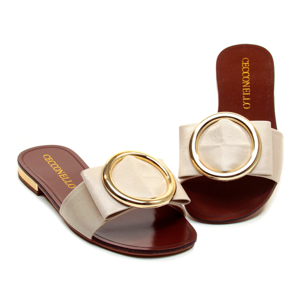 legância e frescor se encontram nesta rasteira em couro off-white, que traduz o luxo discreto com perfeição. a tira larga recebe uma aplicação dobrada com acabamento impecável e é adornada por uma argola metálica dourada — elemento que eleva o visual com sofisticação contemporânea. o solado traz um detalhe dourado no calcanhar, criando um contraste sutil e elegante. versátil e refinada, esta peça é ideal para looks monocromáticos, produções em tons neutros ou como ponto de luz em combinações minimalistas.