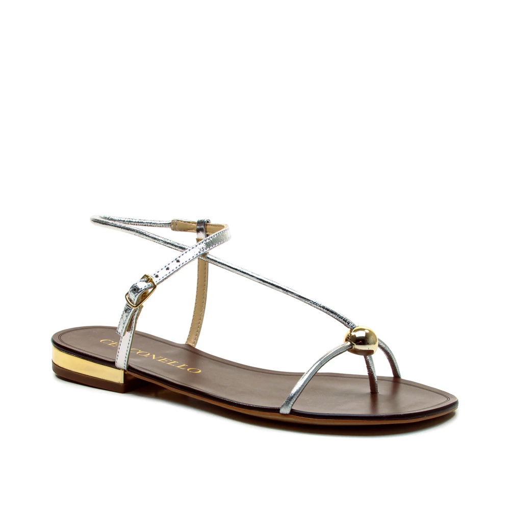 minimalismo e sofisticação caminham lado a lado nesta sandália rasteira em couro. o modelo apresenta tiras finas que abraçam delicadamente o pé, com aplicação de esfera metálica dourada que adiciona um ponto de brilho elegante. o solado em tom amadeirado com detalhe dourado no calcanhar complementa o design com um toque refinado. versátil e confortável, é ideal para acompanhar produções urbanas e frescas — do look de verão à composição chic de final de semana.