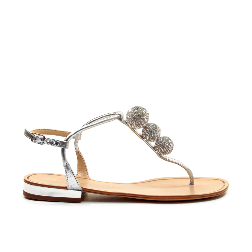 sandália rasteira feminina confeccionada em couro metalizado prateado, com design moderno e sofisticado. o modelo em formato de t é adornado por três esferas cravejadas de brilhos, que adicionam um toque glamouroso e elegante. o fechamento por fivela lateral garante ajuste confortável, enquanto o solado levemente espelhado no calcanhar traz um charme extra. uma peça que combina leveza e sofisticação, ideal para elevar produções diurnas e noturnas com estilo e personalidade.