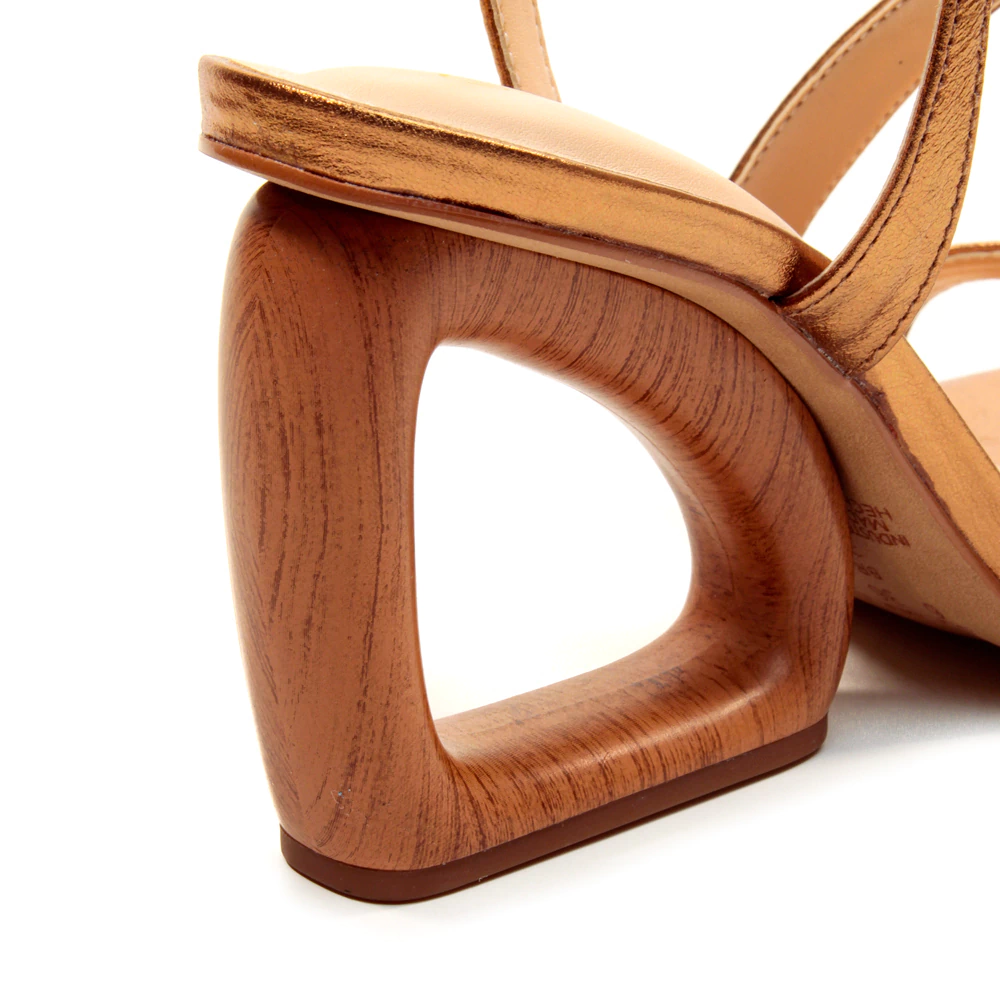 com design marcante e sofisticado, esta sandália em couro cristal bronze combina elegância e modernidade. o salto médio escultural com recorte vazado e acabamento amadeirado dá um toque arquitetônico ao modelo. as tiras finas criam um visual leve, enquanto o bico quadrado reforça a estética contemporânea. o fechamento com fivela no tornozelo garante ajuste seguro. ideal para looks refinados com um toque criativo.