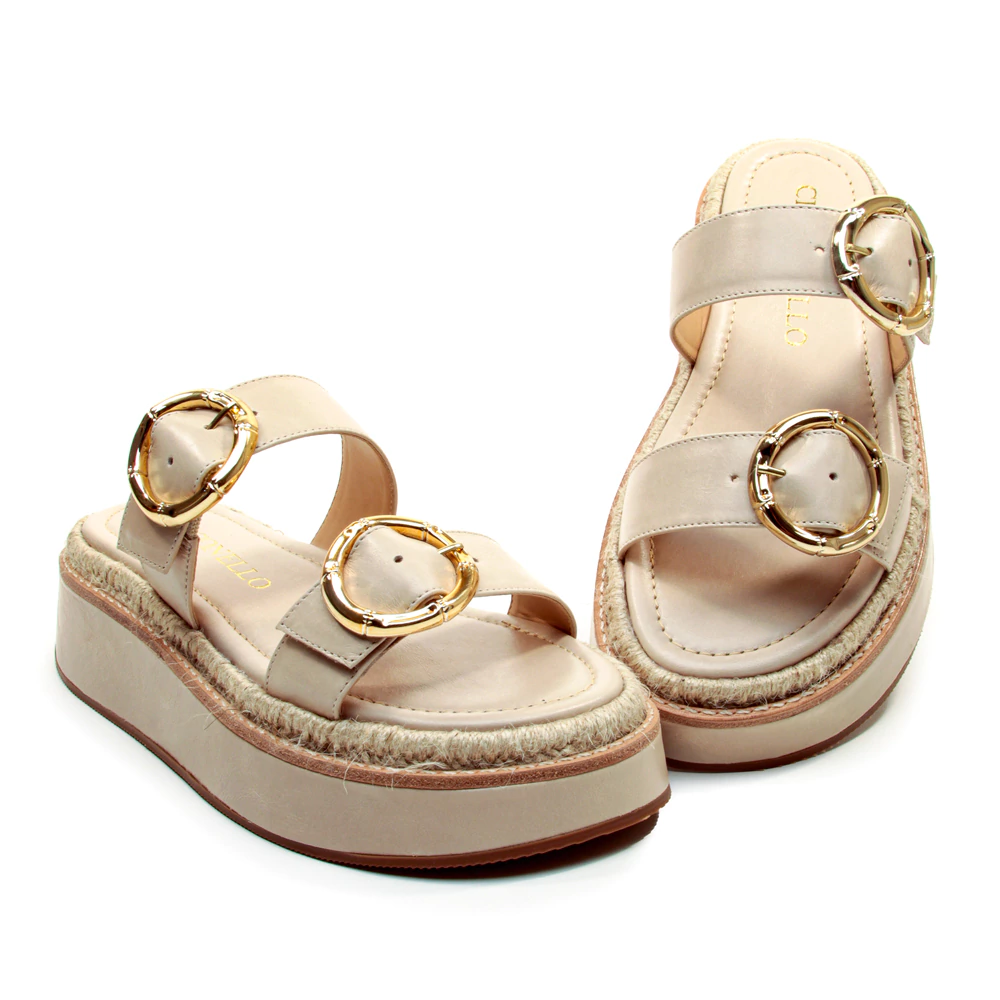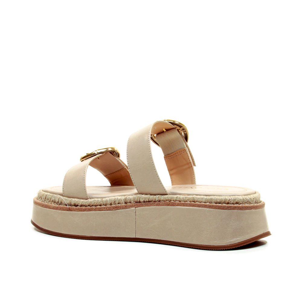 sandália flatform confeccionada em couro, que combina estilo moderno e sofisticação. o design conta com duas tiras largas, cada uma adornada por uma imponente fivela estilizada, que agrega personalidade e charme à peça. o detalhe em corda de rami na vira da palmilha traz um toque natural e artesanal, equilibrando o visual contemporâneo com elementos orgânicos. ideal para quem busca um calçado versátil, confortável e repleto de estilo, perfeito para compor looks elegantes e despojados.