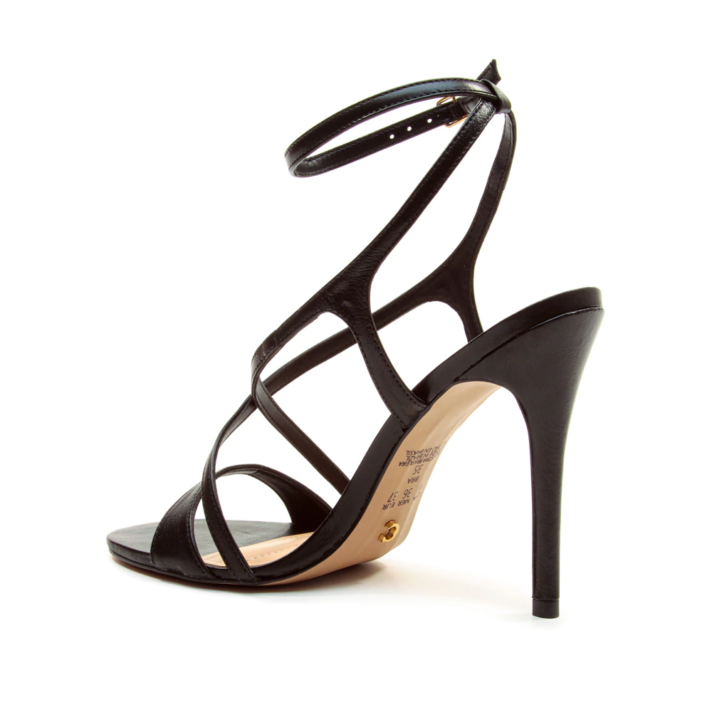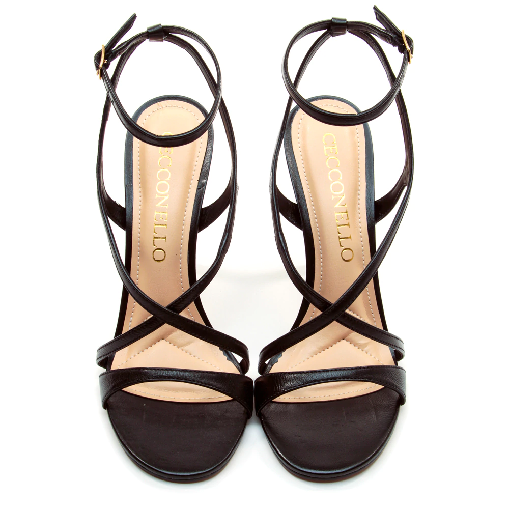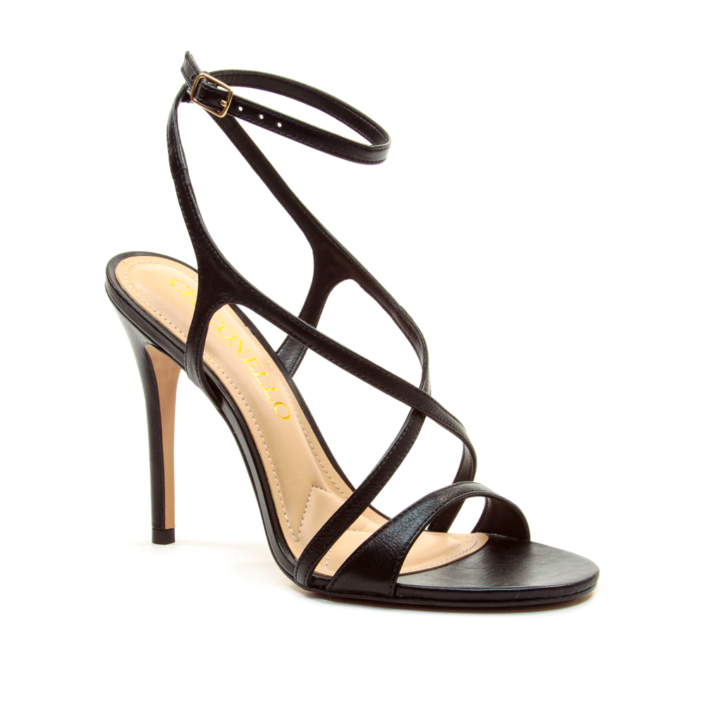 uma sandália de salto alto que traduz pura sofisticação. confeccionada em couro preto, o modelo conta com tiras finas que se entrelaçam de forma delicada pelo peito do pé, garantindo um visual moderno e sedutor. o fechamento por fivela no tornozelo proporciona ajuste seguro e confortável, enquanto o salto fino alonga a silhueta com elegância. uma escolha versátil e glamourosa, perfeita para produções noturnas e ocasiões especiais.