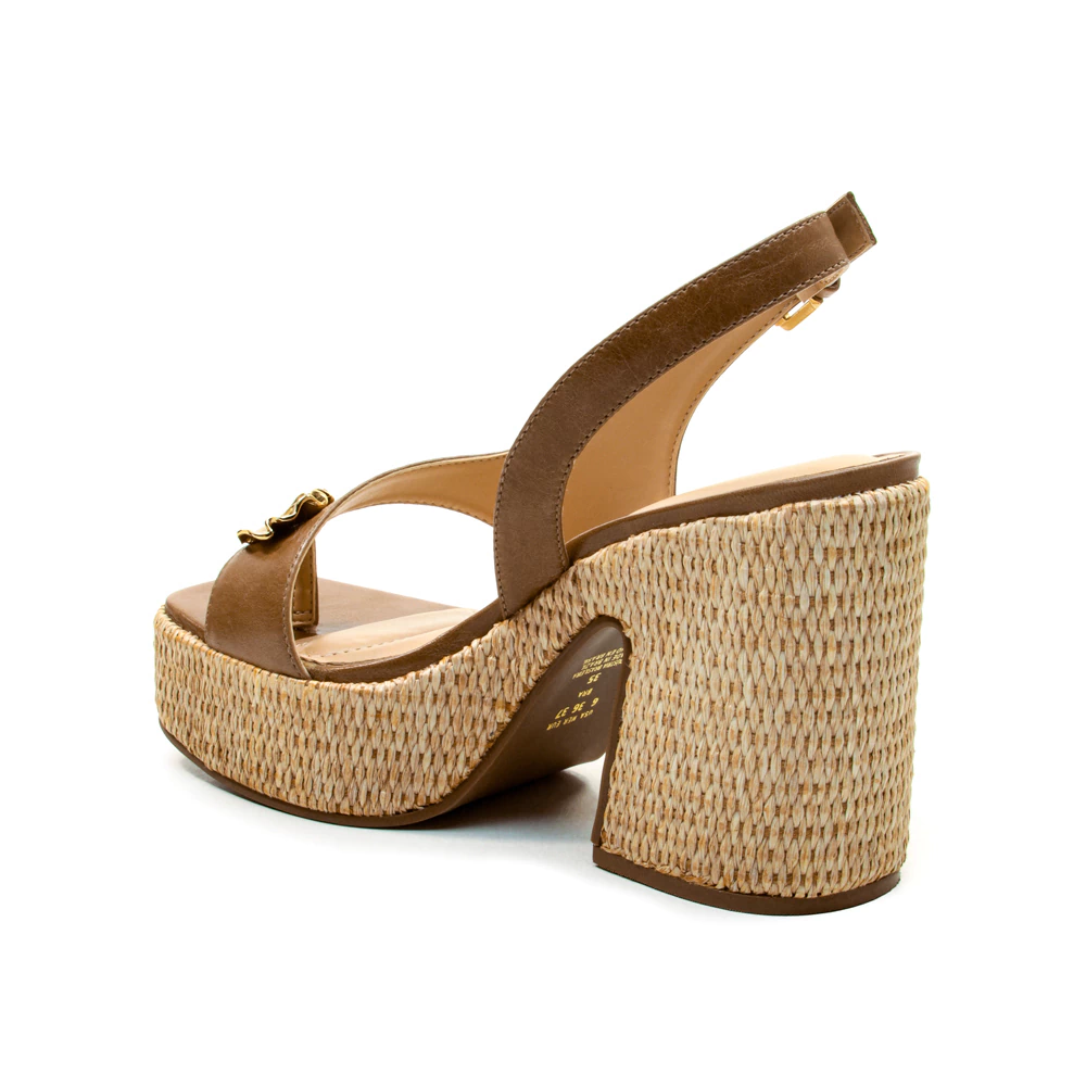 com um visual que traduz o equilíbrio perfeito entre o rústico e o sofisticado, esta sandália plataforma é confeccionada em couro e apresenta salto alto revestido em rafia natural, realçando a inspiração artesanal. o modelo conta com tira central que abraça o dedão e é adornada por um elegante aplique dourado em forma de concha, trazendo um toque praiano e sofisticado. a fivela metálica garante ajuste perfeito e segurança ao caminhar. ideal para produções frescas e elegantes nos dias mais quentes.