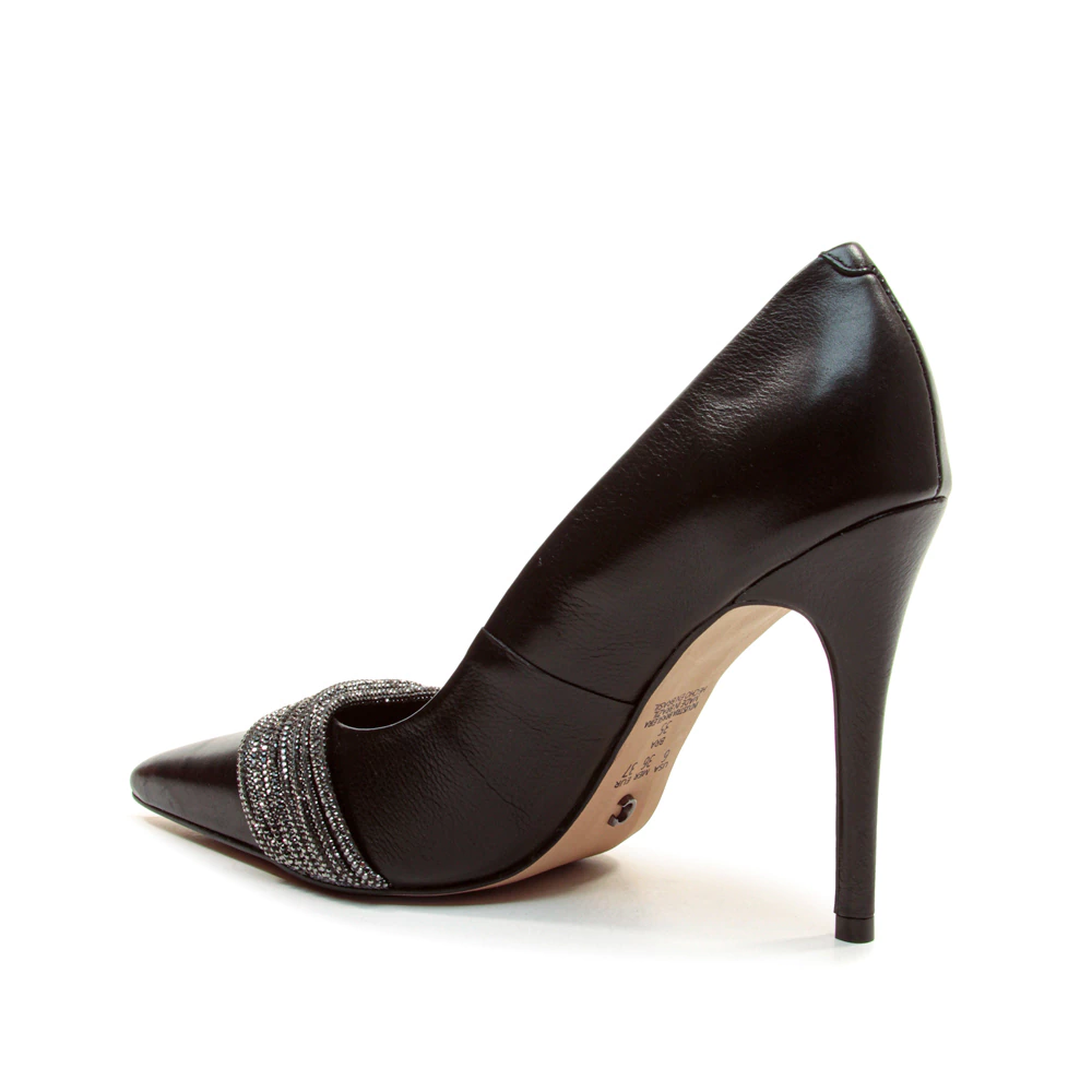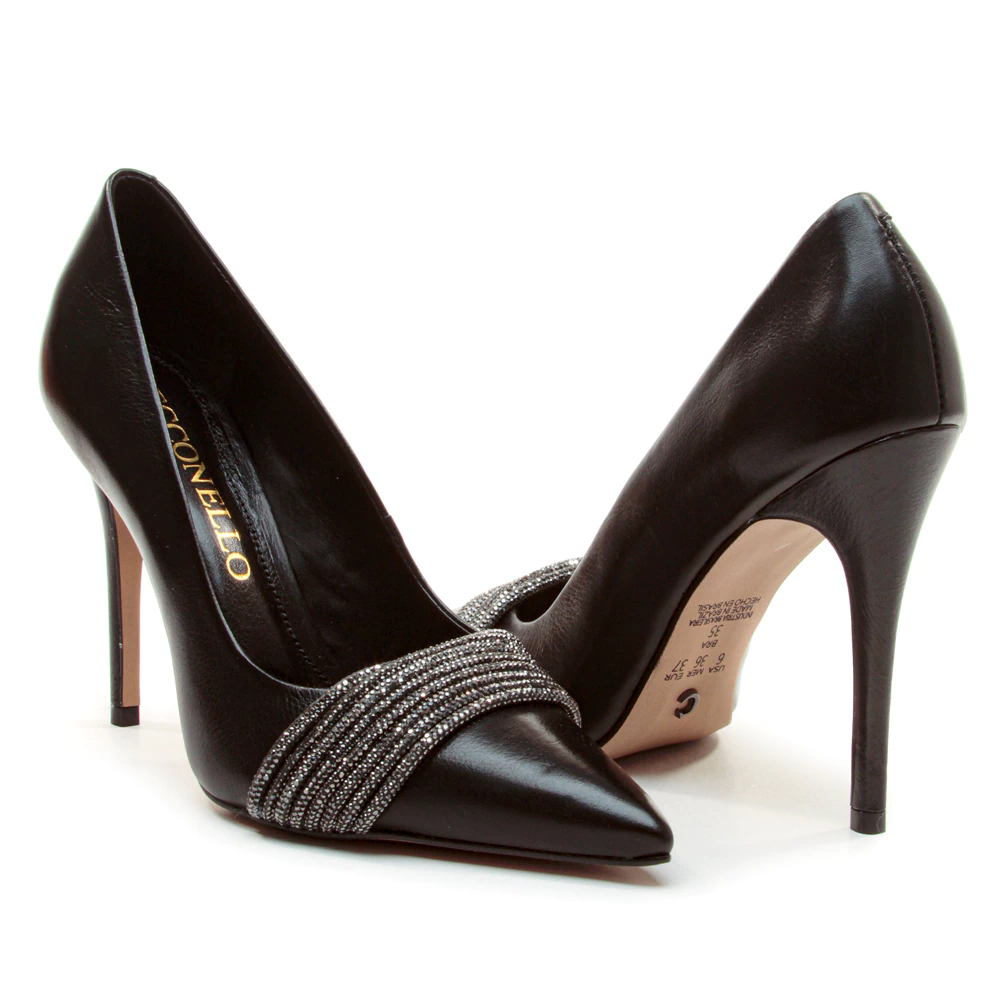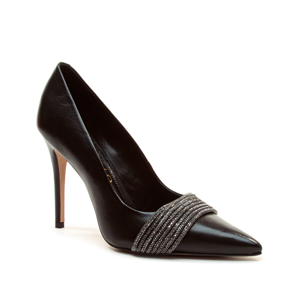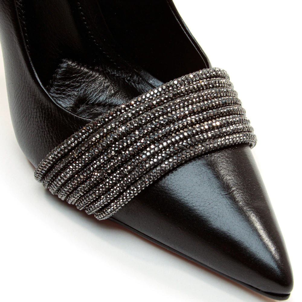clássico e imponente, este scarpin em couro preto ganha uma releitura glamourosa com o detalhe de tiras bordadas em microcristais no cabedal. o bico fino alonga a silhueta e reforça a sofisticação, enquanto o salto alto fino garante um toque de poder ao look. um modelo que transita perfeitamente entre produções de trabalho mais refinadas e eventos noturnos cheios de estilo, unindo elegância atemporal e brilho contemporâneo.