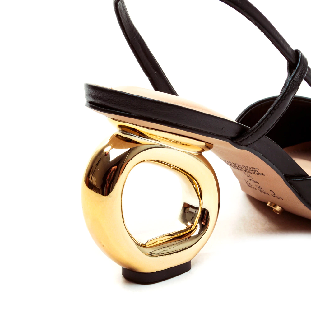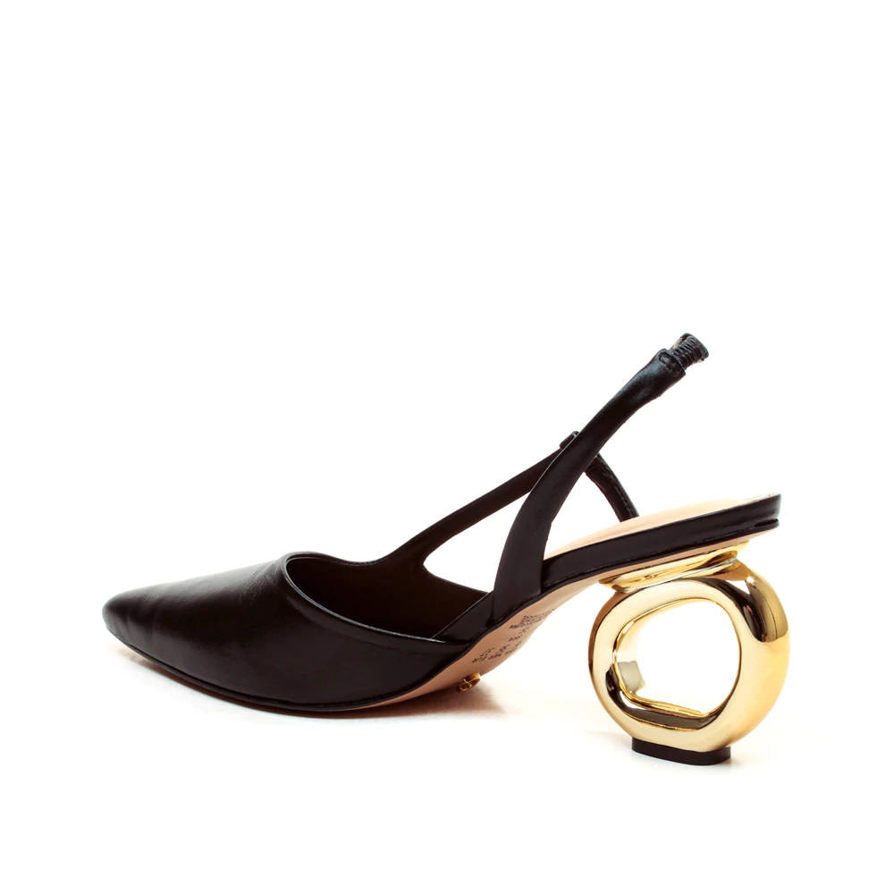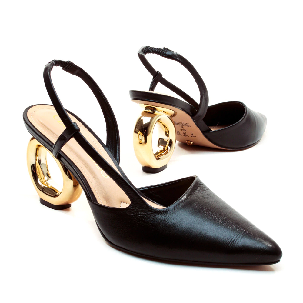 um slingback feminino elegante e moderno, confeccionado em couro de alta qualidade. com a parte interna do pé aberta, proporciona uma sensação de frescor e sofisticação, ideal para looks de meia-estação. o bico fino adiciona um toque refinado, enquanto o salto médio vazado com acabamento cromado traz um toque contemporâneo e futurista. perfeito para quem busca versatilidade, conforto e um design arrojado, ideal para composições que transitam do casual ao formal com facilidade e estilo.