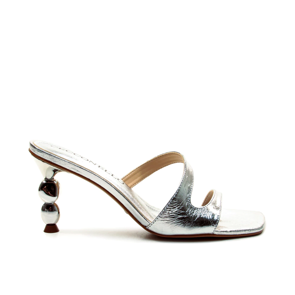 poder e elegância em cada passo. esta open mule em couro metalizado aposta no brilho intenso e no design artístico para criar uma peça de impacto. o salto escultural em pedras cromadas trazem sofisticação contemporânea, enquanto as tiras minimalistas garantem conforto e estilo. uma escolha perfeita para looks noturnos, festas ou eventos que pedem glamour.