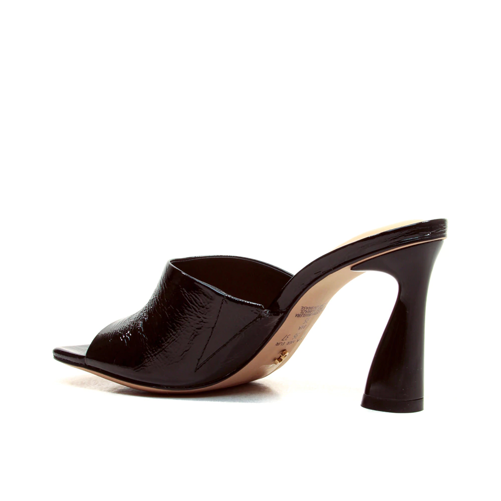 tamanco sofisticado confeccionado em couro, exalando elegância e modernidade. seu design apresenta uma gáspea larga que proporciona um ajuste confortável, combinada com um bico quadrado que confere um toque contemporâneo. o salto alto escultural, com pintura em acabamento verniz, adiciona um toque imponente e refinado, tornando este modelo perfeito para quem busca sofisticação e estilo marcante.